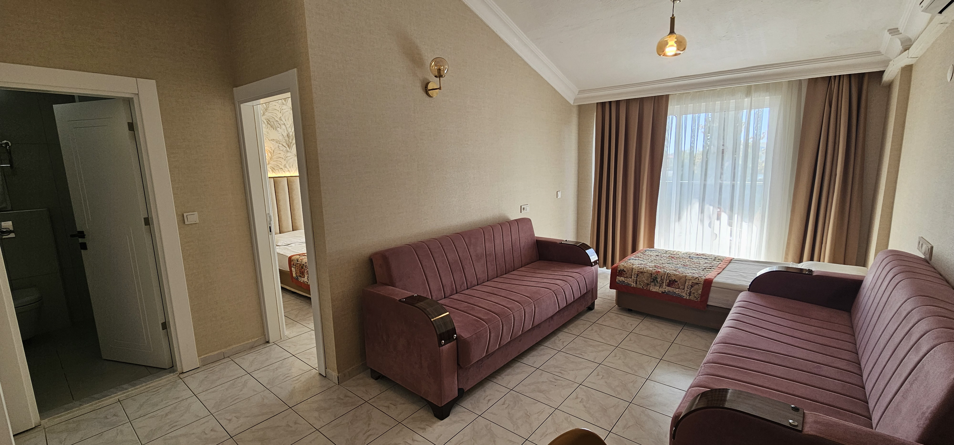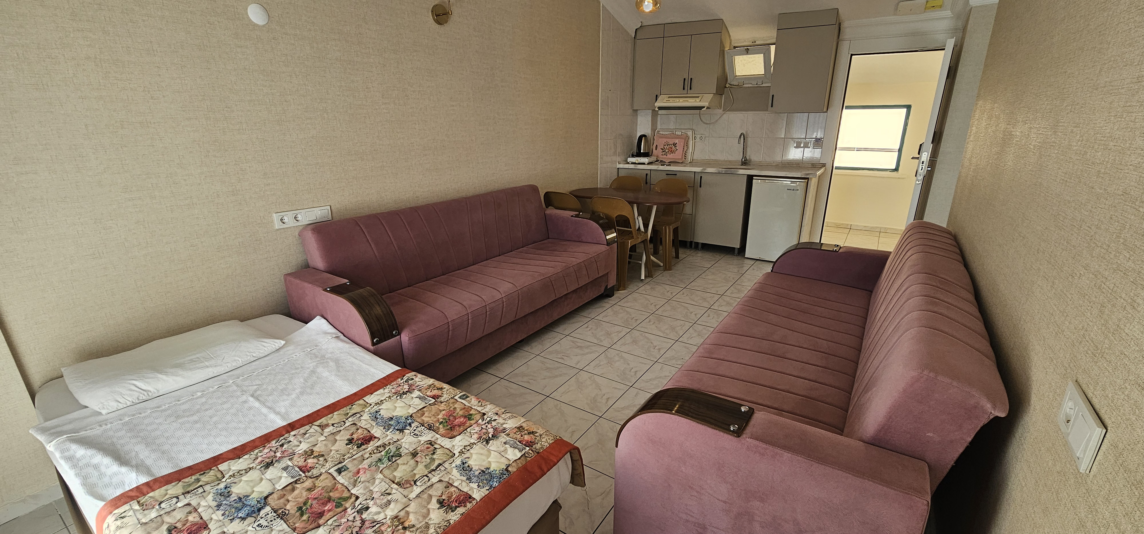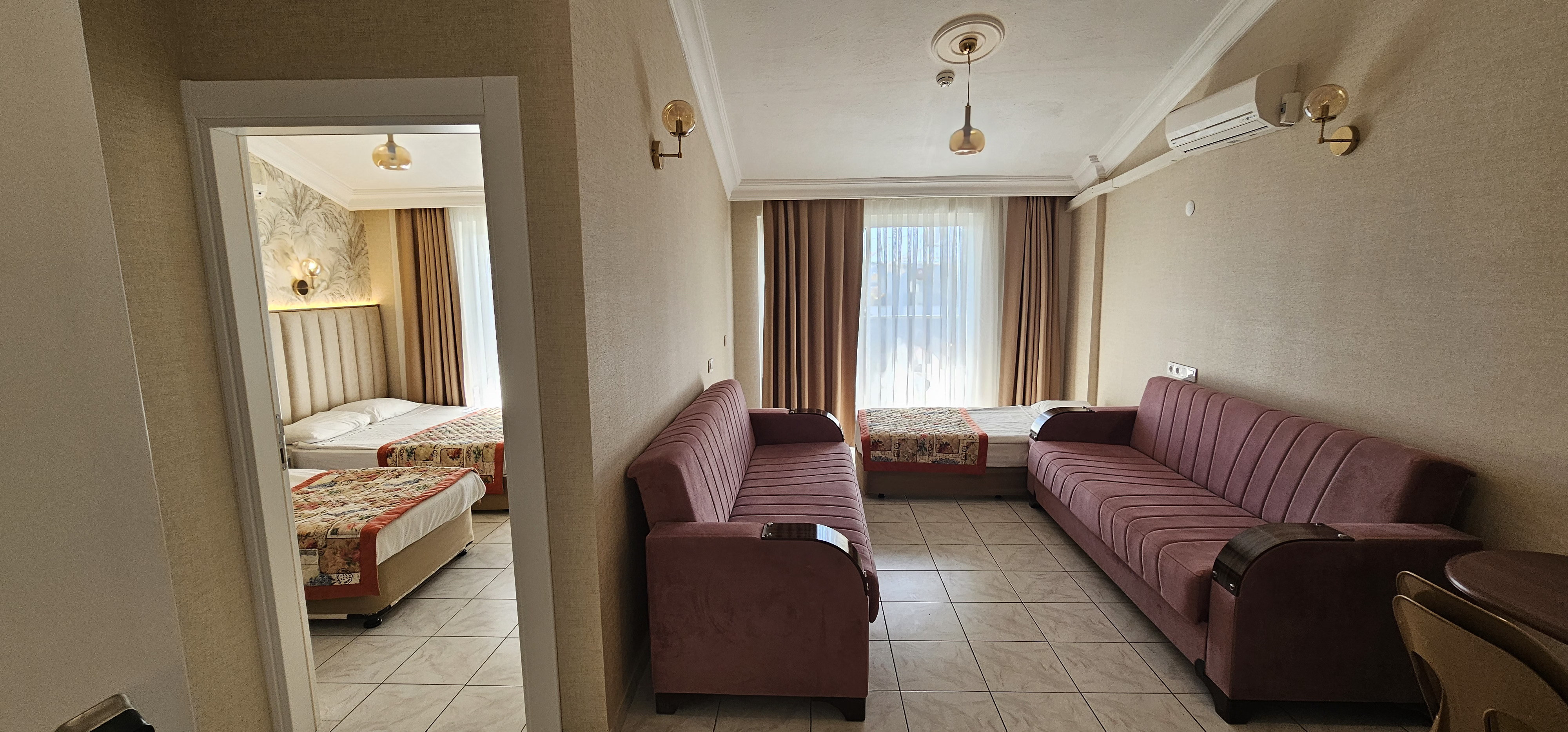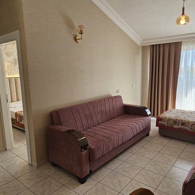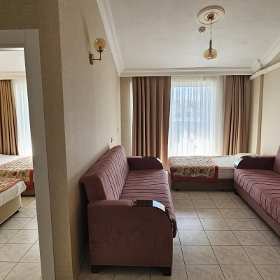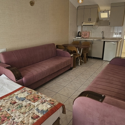 55-60 m2 büyüklükte, 1 salon 1 yatak odası ve mutfaktan oluşmaktadır Salon ve yatak odasında ayrı klimalar bulunur. Apart dairelerimizde maximum 6 kişi konaklayabilir. Yatak odasında 1 çift kişilik,1 tek kişilik yatak; salonda 1 tek kişilik yatak ve 2 adet kanepe bulunur. Kanepeler açılır ve yatak halini alır. Odalarda TV ve kasa bulunur. Mutfakta buzdolabı, elektrikli pişirici, tost makinesi, su ısıtıcısı, yemek pişirme ve servis gereçleri bulunmaktadır.Asansör vardır. Wc ve duş mevcuttur.